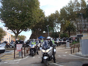 La reserva de la Vstrom 1000 son de litros, es decir, unos 80 kms, pero, me entra el agobio, y busco a la organización, para preguntar donde esta la gasolinera más cercana, (que seguro que sabían donde había una...), y me recomiendan, (tras preguntar a una Gendarme francesa preciosa, pero, más mosquea un mono..., ya que de repente, de ser un pequeño aparcamiento para visitar el castillo, en un pequeño pueblo que nunca pasa nada, a pasar a recibir 64 motos, colapsando los accesos...., con razón estaba un poco mosca), retroceder al pueblo anterior para poder respostar, a Port Vendres, (que por otro motivo, siempre recordare este pueblo...).