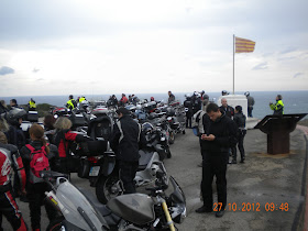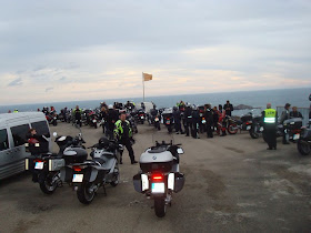 para poco más tarde, pasar a la preocupación por los compañeros del segundo grupo, que todavía no habían conseguido bajar. Además, de que al final, cuanto más tiempo pasaba, más fuerte nos volvía a golpear el viento, aún estando abajo..., con el consiguiente peligro de volver a tener caídas con las motos paradas, e incluso, que alguna RT acabara con la cúpula rota. En consecuencia, tras un rato más de espera, la organización, muy acertadamente, decide sacarnos de allí al primer grupo, (el segundo grupo llegaría más tarde), y seguir camino del hotel, ya que desde allí abajo no podíamos hacer nada, y subir otra vez, con la carretera tan estrecha, y los fuertes vientos, no era en absoluto recomendable.